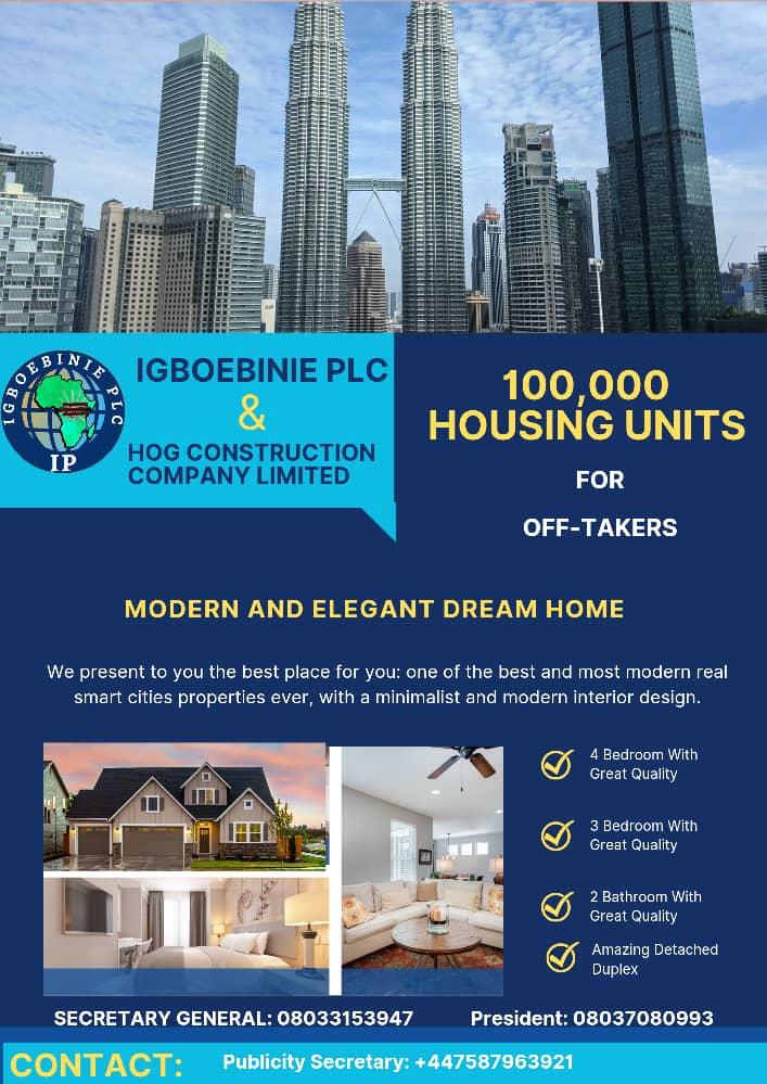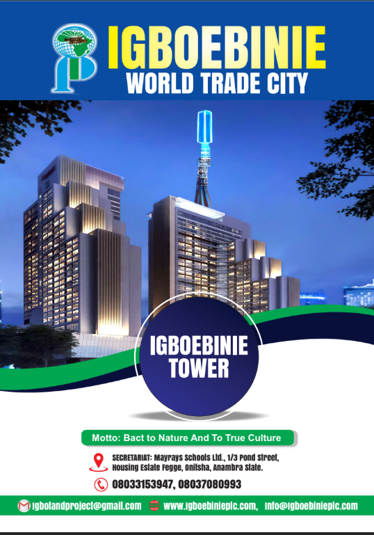 Igboebinie PLC, in partnership with Hand of God Construction Company Ltd, proudly introduces the Igboebinie World Trade City, Igboebinie Project, and the iconic Akụlọụnọ Initiative—a bold vision featuring 100,000 Housing Units, Smart Cities, Industrial Hubs, and Farm Settlements across all of Igboland.